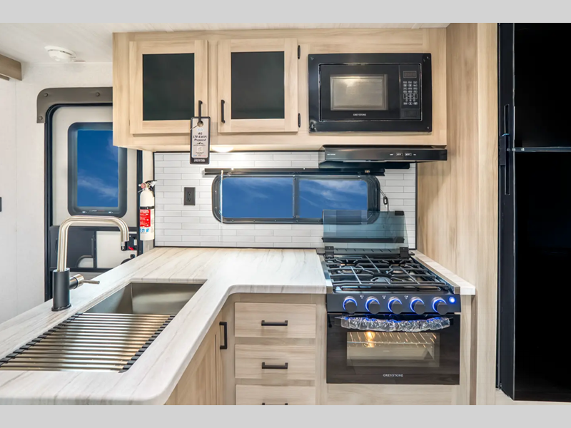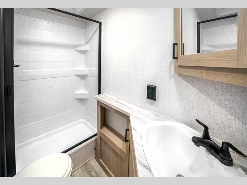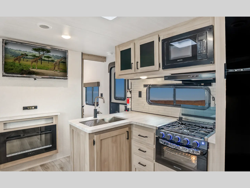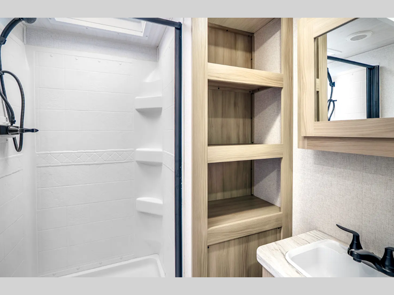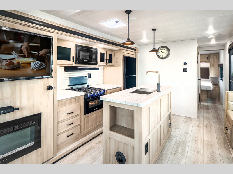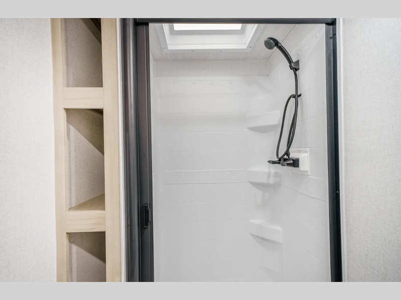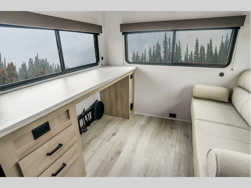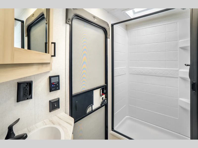 Each is built with an enclosed and heated underbelly plus enclosed holding tanks for four seasons of travel, and include a power tongue jack with an LED light for easy setup day or night. The interior includes seamless pressed countertops, upgraded design package, an 81" ceiling height, plus many more comforts. You will be able to do and see more with the Adventure Outdoor Package with a universal docking station, solar prep, an outside shower, and more!
