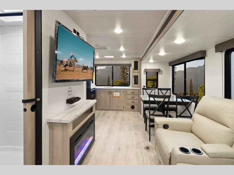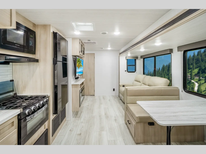 Sleeps 5 Slides 1 Length 30 ft 6 in Ext Width 8 ft Ext Height 11 ft 3 in Int Height 6 ft 9 in Hitch Weight 775 lbs Dry Weight 6473 lbs Cargo Capacity 3102 lbs Fresh Water Capacity 40 gals Grey Water Capacity 60 gals Black Water Capacity 30 gals Furnace BTU 35000 btu Available Beds King Refrigerator Type 12V Refrigerator Size 10.7 cu ft Cooktop Burners 3 Shower Size 30" x 36" Number of Awnings 1 Water Heater Type Tankless AC BTU 15000 btu Awning Info Electric with LED Lights Axle Count 2 Washer/Dryer Available Yes Shower Type Standard Electrical Service 50 amp Similar Floorplans