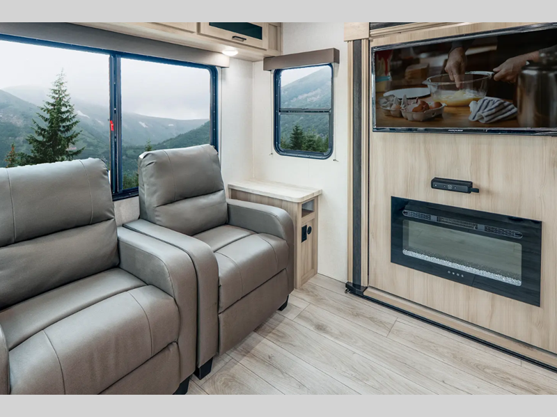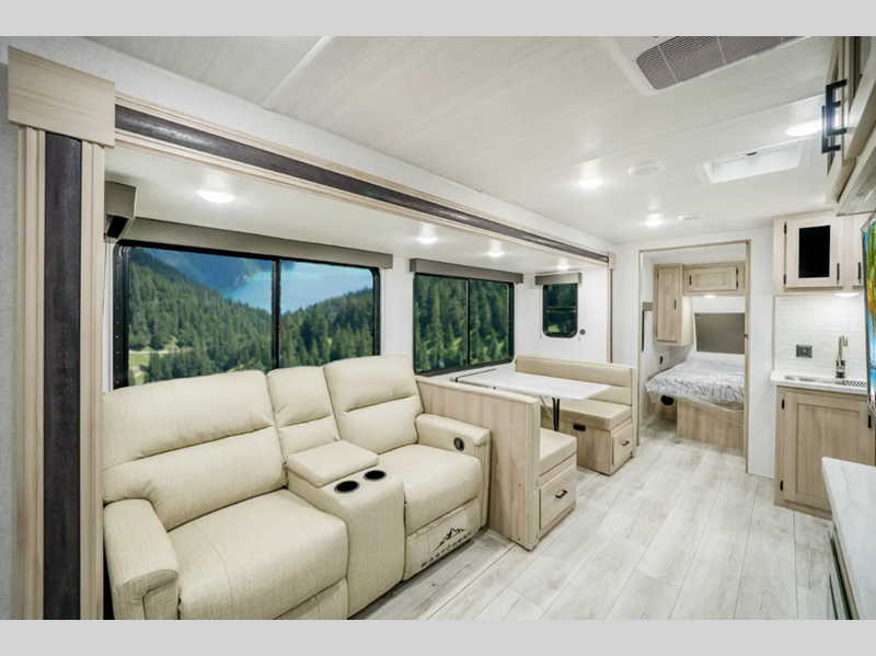Sleeps 4 Slides 2 Length 34 ft Ext Width 8 ft Ext Height 11 ft 3 in Int Height 6 ft 9 in Hitch Weight 835 lbs Dry Weight 7963 lbs Cargo Capacity 1672 lbs Fresh Water Capacity 40 gals Grey Water Capacity 60 gals Black Water Capacity 30 gals Furnace BTU 35000 btu Available Beds King Refrigerator Type 12V Refrigerator Size 10.7 cu ft Cooktop Burners 3 Shower Size 30" x 36" Number of Awnings 1 Water Heater Type Tankless AC BTU 15000 btu Awning Info Electric with LED Lights Axle Count 2 Shower Type Standard Electrical Service 50 amp Similar Floorplans